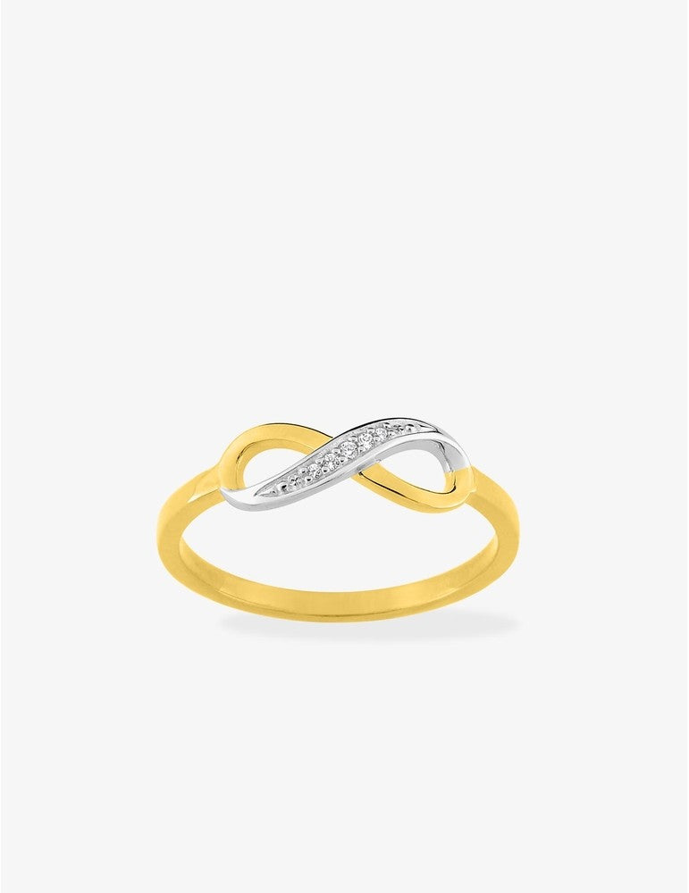 Cette bague en plaqué or possède un motif infini de 13 mm de longueur dont une partie est en rhodium serti d'oxydes de zirconium. Un précieux symbole d'éternité.