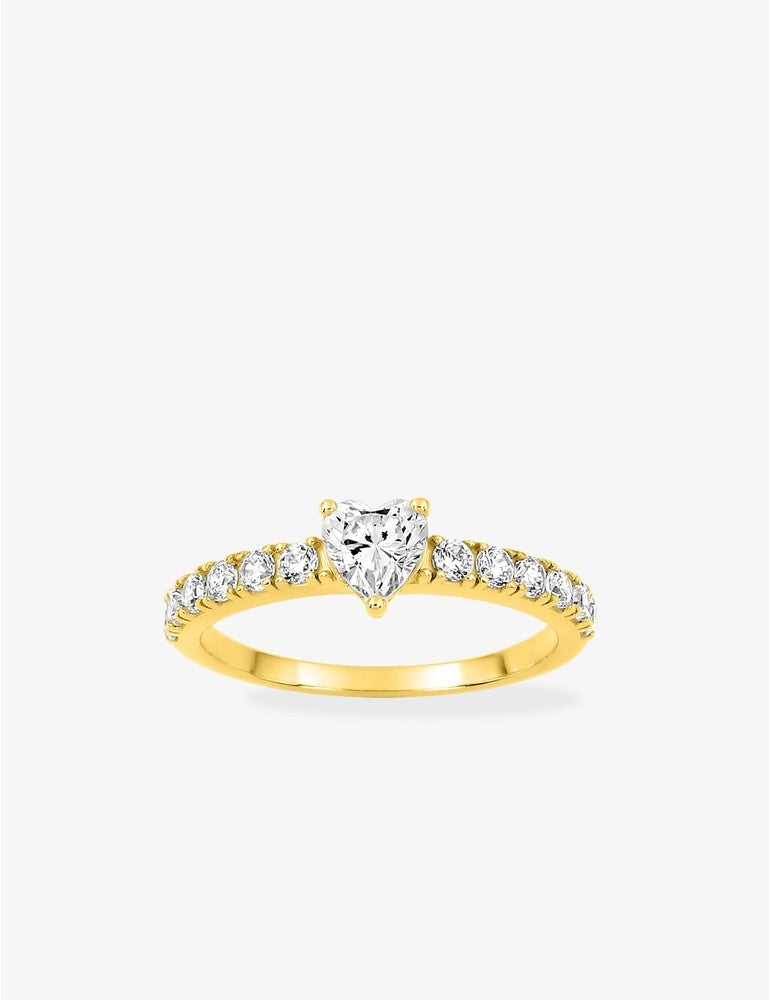 Ce solitaire en plaqué or arbore un oxyde de zirconium en forme de cœur de 6 mm de hauteur serti griffes accompagné d'oxydes de zirconium de 2 mm sur du rhodium. Ce bijou éclatant saura sublimer vos mains.