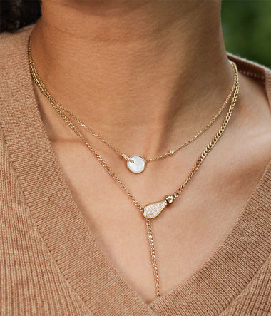 Collier en acier uni ou doré à l’or fin par ionisation serti d'un rond en nacre ainsi que d'un anneau serti de zirconiums.