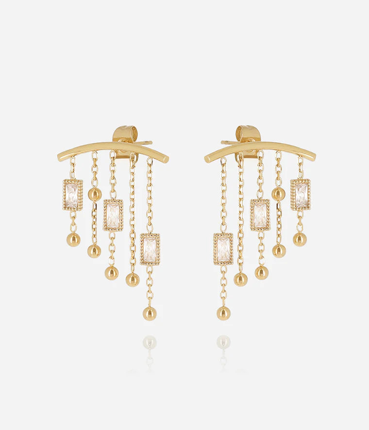 Boucles d'oreilles en acier uni ou doré à l'or fin par ionisation. Elles sont composées d'un arc de cercle en acier sur lequel sont serties 5 chainettes. 3 rectangles en zirconium sont reliés aux chainettes.