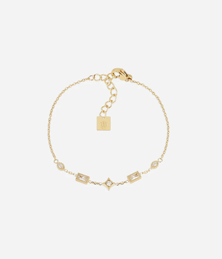 Bracelet en acier uni ou doré à l'or fin par ionisation, sur lequel sont sertis des zirconiums de formes différentes.