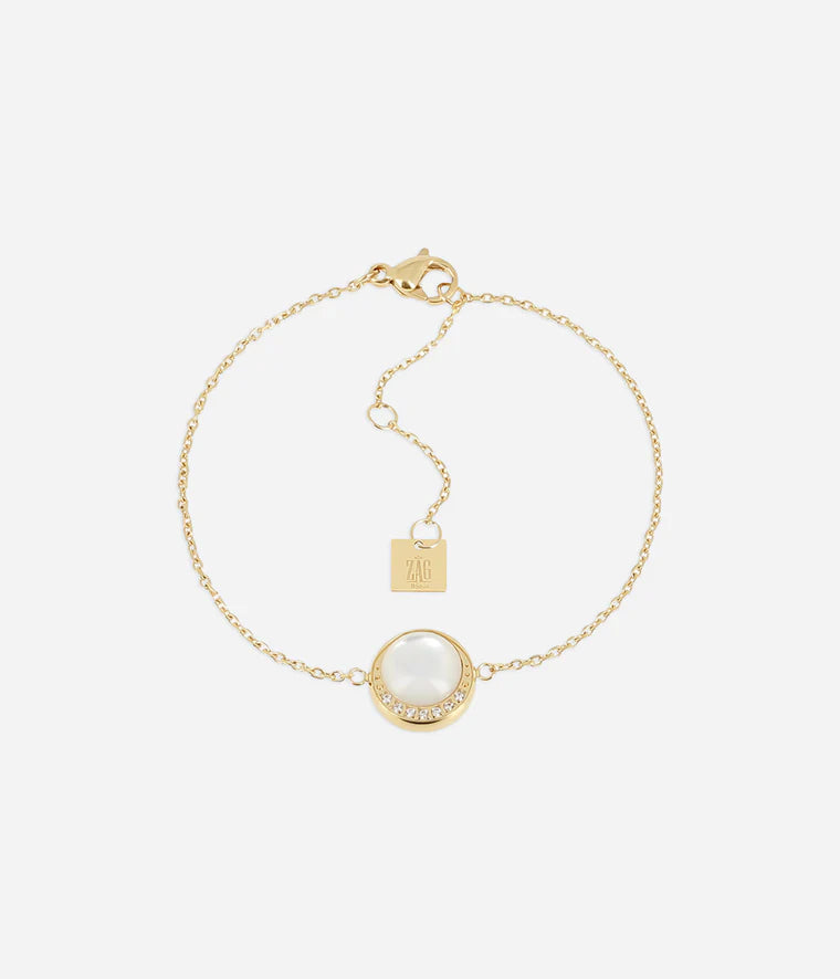 Bracelet en acier uni ou doré à l'or fin par ionisation, sur lequel se trouve un pendentif rond serti d'une nacre et de zirconiums.