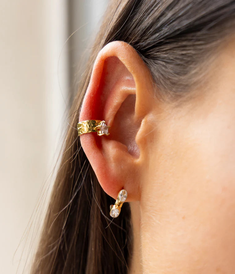 Un earcuff en acier doré à l'or fin par ionisation serti d'un zirconium en forme d'étoile qu'il suffit simplement d'enfiler sur l'oreille.