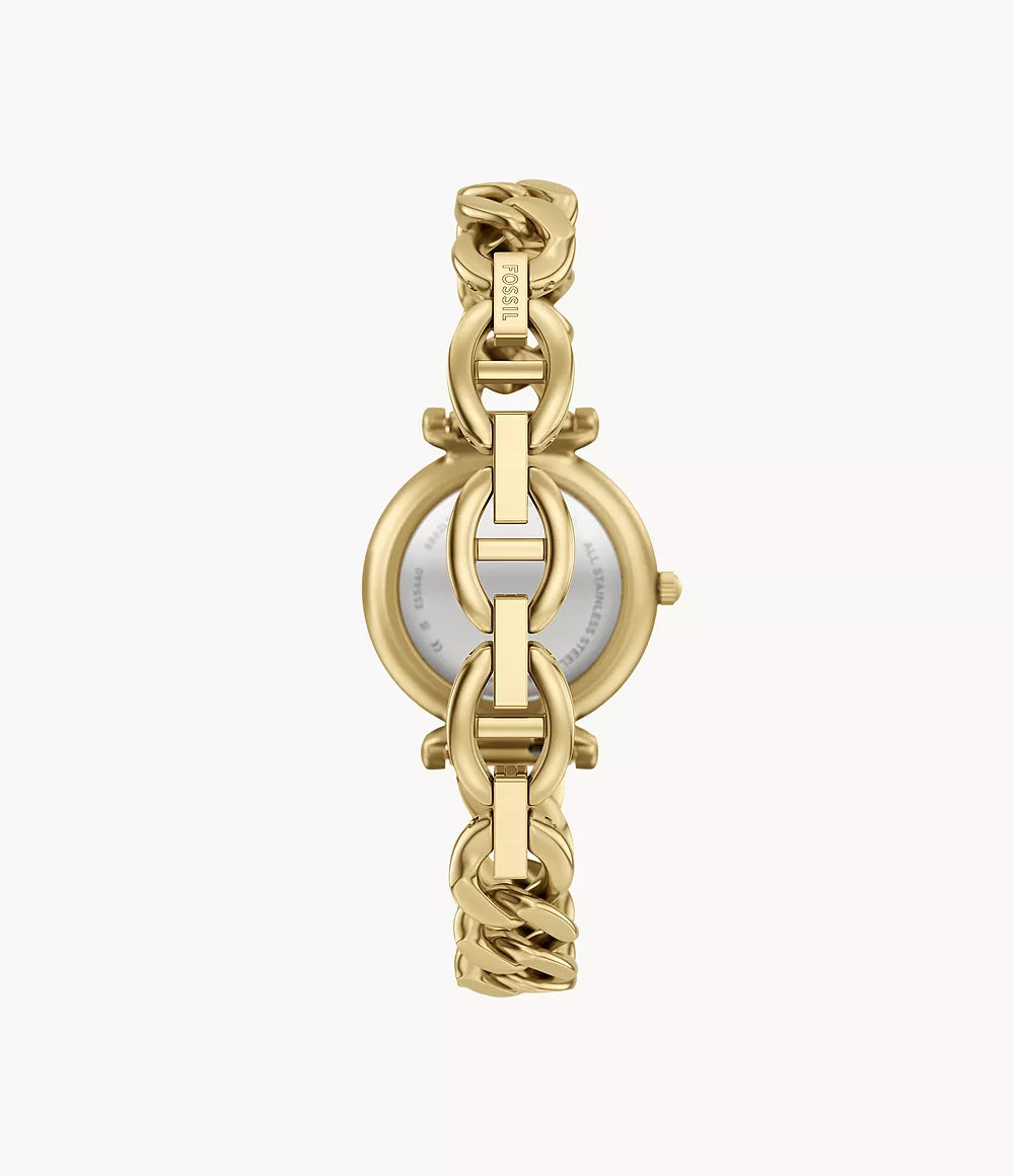 Cette montre associe un bracelet en acier inoxydable doré à un boîtier rond assorti pour créer un look harmonieux et étincelant. Le cadran noir brillant séduit par sa finition lisse et profonde, tandis que les aiguilles épurées assurent une lecture discrète et fonctionnelle. Conçu pour être porté facilement, ce bracelet chaîne est doté d’un fermoir « Adjust-O-Matic » pour un ajustement personnalisé.