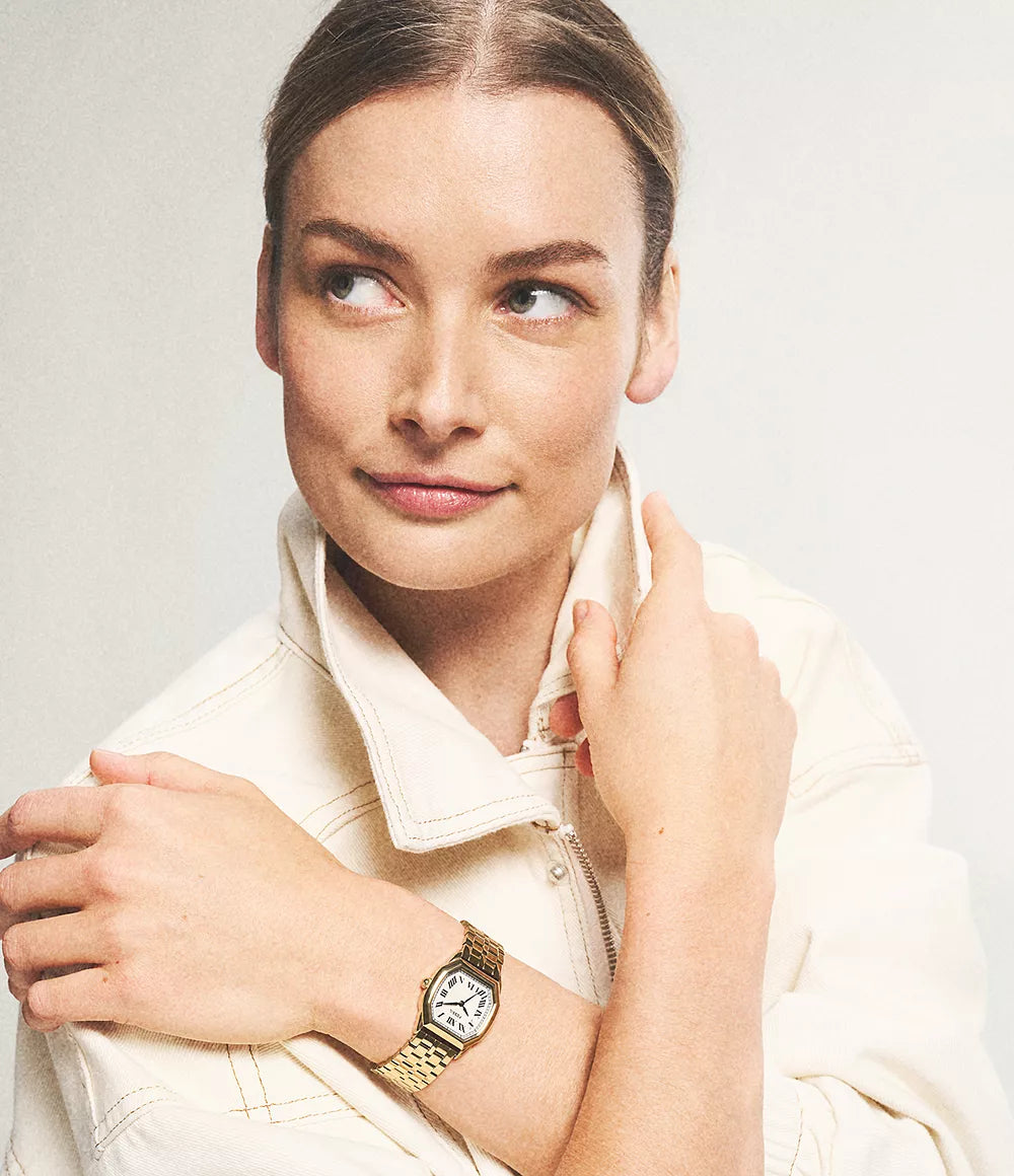 Reprenant l’un de nos modèles classiques, Harlow allie la sophistication du passé à la modernité actuelle. Cette montre-bracelet raffinée à cinq maillons en acier inoxydable poli-brillant présente un boîtier octogonal, un cadran crème texturé et un mouvement à trois aiguilles.