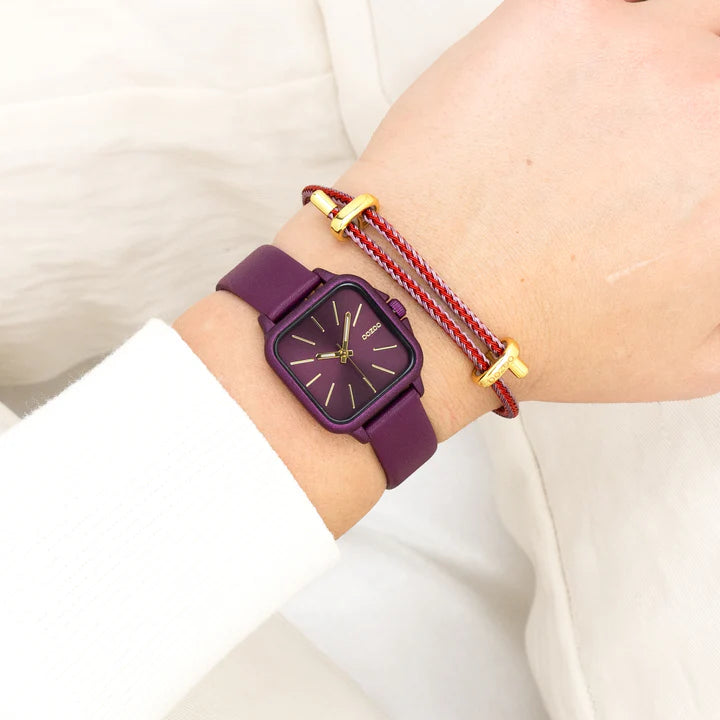 Distinguez-vous avec ce magnifique modèle femmes carré de la collection tendance OOZOO Timepieces. Cette nouvelle création (C11668) est enjolivée d’un bracelet en cuir bordeaux et d’un boîtier tendance mat bordeaux de 34x34 mm de diamètre. Faites sensation avec ce cadran bordeaux sunray et un index couleur or rayures et des aiguilles assorti. Cette montre est un incontournable de votre garde-robe et possède un verre minéral.