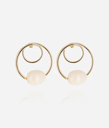 Boucles d'oreilles en acier uni ou doré à l’or fin par ionisation composées d'un motif en double rond sur lequel est serti une perle en acétate blanche.
