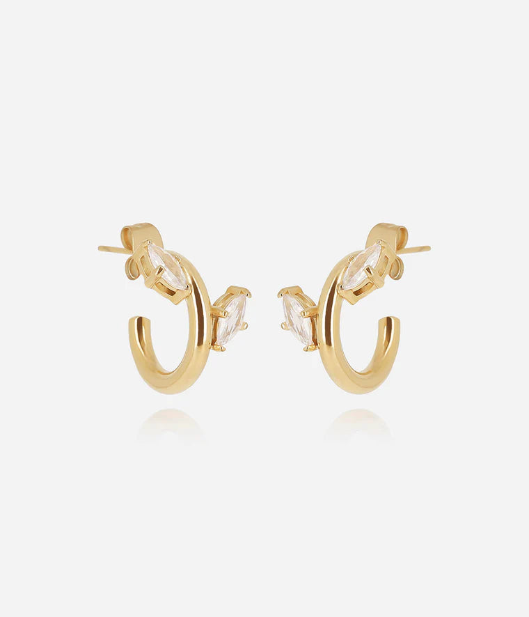Boucles d'oreilles créoles en acier uni ou doré à l'or fin par ionisation deux petits zirconiums en forme de goutte et de losange sont sertis sur la créole.