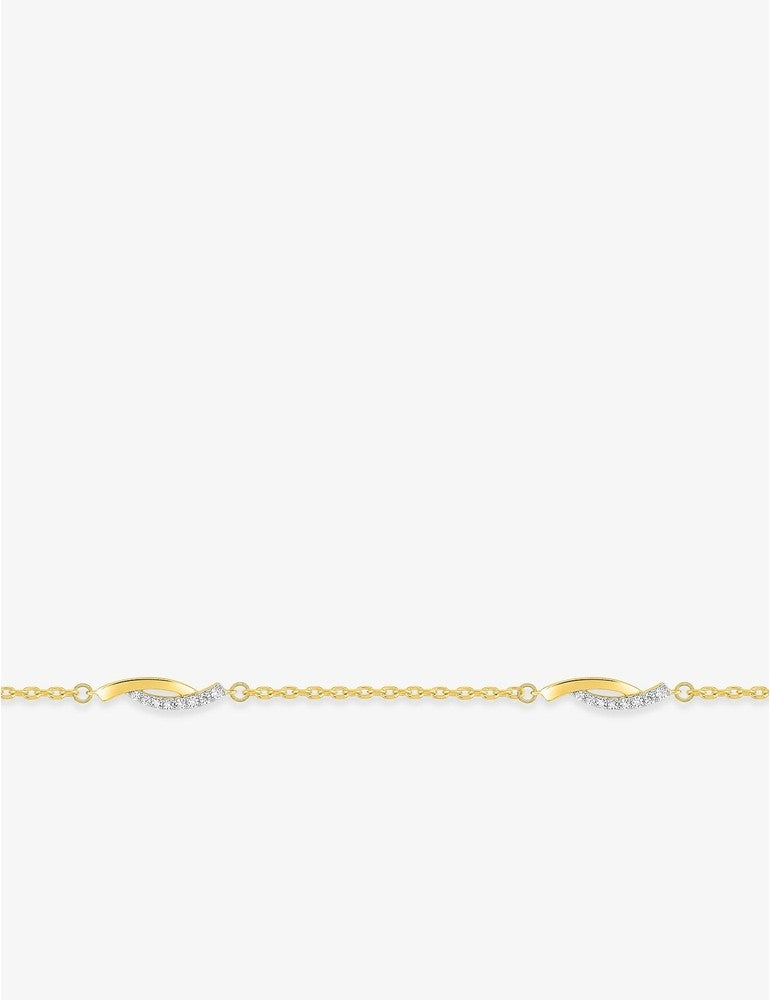 Ce bracelet en plaqué or possède trois motifs de courbes sertis d'oxydes de zirconium sur du rhodium. Il mesure 18 cm de longueur et se ferme grâce à un fermoir anneau ressort.
